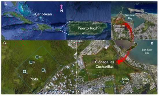(A) Ciénaga las Cucharillas located on the northern coast of the Caribbean Island of Puerto Rico, at the western side of the San Juan Bay, (B) study area (2.2 ha), and (C) study plots 3, 5, 10, and 6.
