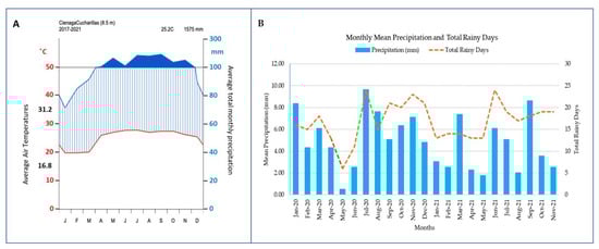 (A) The climate diagram illustrates monthly average air temperatures in °C (left y-axis, in red) and average total monthly precipitation in mm(right y-axis, in blue) from January 2017 to December 2021 (months are represented by letters) at Ciénaga Las Cucharillas Natural Reserve []. (B) The graph presents the mean monthly precipitation and the total number of rainy days, using climatological data from January 2020 to November 2021, sourced from the Toa Baja Levittown, PR Meteorological Station [].