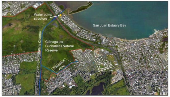 The study took place over 2.2 ha (research area) within Ciénaga Las Cucharillas Natural Reserve, a palustrine–estuarine coastal urban wetland on the northern coast of the Caribbean Island of Puerto Rico. The reserve is in the municipality of Cataño (18 26′25.27″ N, 66 08′08.39″ W). The wetland comprises the western side of the San Juan Bay (Figure 1A).