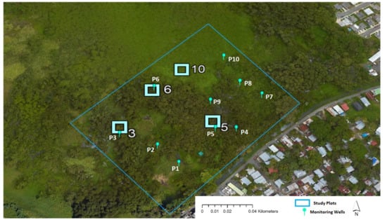 Four study plots (3, 5, 6, and 10), each encompassing 100 square meters, were established in a research area within the natural reserve, with each plot featuring distinct physicochemical factors and habitat types. The naming of the plots as 3, 5, 6, and 10 refers to their corresponding pre-established monitoring wells (Figure 4), which have been in place since 2017. This approach was chosen to maintain consistency with the long-term phreatic level and salinity monitoring data available from these wells.