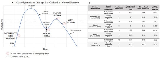 (A) Schematic diagram of the wetland hydrodynamics showing the phreatic level (m) on the date of sampling, adapted from []. (B) Overview of local total rainy days, precipitation (cm), mean tidal daily range, and mean phreatic level (m) for the 14-day period leading up to and including the sampling date []. These conditions have an influence on the wetland’s hydrodynamics at the time of sampling.
