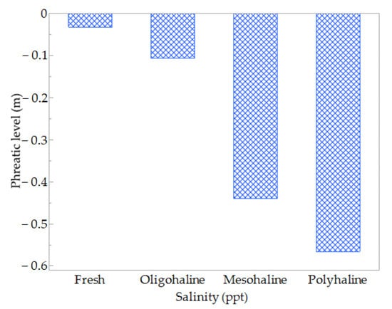 Furthermore, significant negative correlations between phreatic levels with salinity within habitats were identified, as illustrated in Table 5 and Figure 6. Specifically, when the phreatic level was near the surface (with mean values of −0.03 ± 0.10 m and −0.11 ± 0.10 m), freshwater and oligohaline conditions tended to prevail. Conversely, when the phreatic level was lower, at approximately −0.44 ± 0.10 m and −0.57 ± 0.08 m (mean values), mesohaline and polyhaline conditions became more dominant.