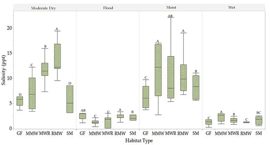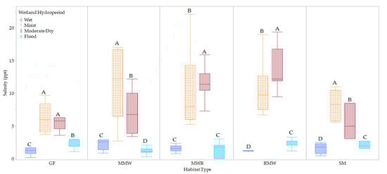 Significant differences in habitat salinity among the hydroperiods. Values not connected by the same letter indicate significant differences (p < 0.05).