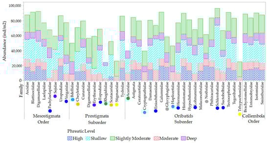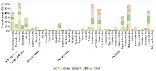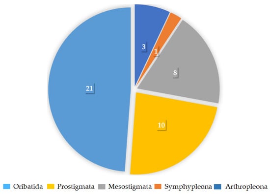 A total of 7478 microarthropods representing 43 families were identified. The microfauna was characterized by 21 families of oribatid mites (suborder Oribatida), 10 families of prostigmatid mites (suborder Prostigmata), 8 families of mesostigmatid mites (order Mesostigmata), and 4 families of springtails (order Collembola). Overall, the suborder Oribatida had the highest number of families. The order Collembola, specifically the suborder Symphypleona (with 1 family), had the fewest families represented (Figure 9).