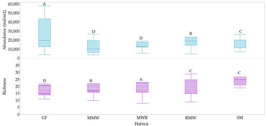 Significant differences in mesofauna richness and abundance between habitats. Values not connected by the same letter indicate significant differences (p < 0.05).
