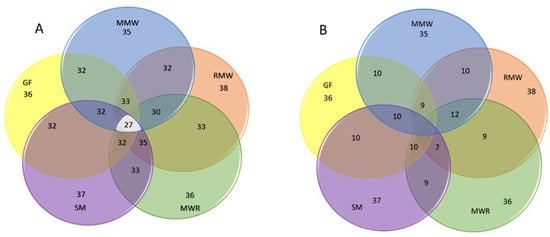 Venn diagram showing the number of (A) shared and (B) non-shared taxa among the habitat types.