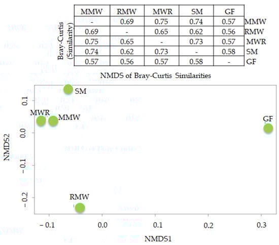 The Bray–Curtis index and non-metric multidimensional scaling (NMDS) analyses revealed that three habitats, the MMW, MWR, and SM, are highly similar to one another. In contrast, the RMW and GF habitats show less similarity to these habitats as well as to each other, as detailed in Figure 12.