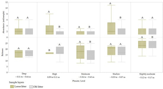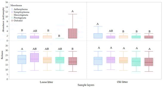 Statistical differences of mesofauna richness and abundance within loose litter and old litter layers. Values not connected by the same letter indicate significant differences (p < 0.05).