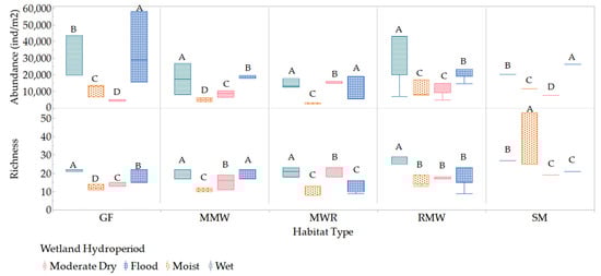Significant differences between habitat salinity per hydroperiods. Values not connected by the same letter indicate significant differences (p < 0.05).