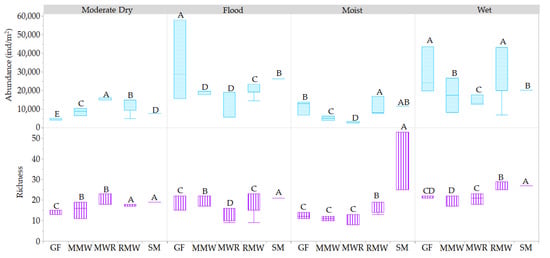 During both wet and flood periods, the peak in mesofauna richness and abundance was observed across various habitats, with these organisms predominantly inhabiting the loose litter layer. Sampling during both periods coincides with the receding of floodwaters. This prevalence suggests that habitat conditions during both hydroperiods, characterized mostly by shallow to moderately shallow phreatic levels (0.01 ± 0.07 m, −0.12 ± 0.03 m) and oligohaline salinities (1.61 ± 1.07 ppt, 1.97 ± 0.8 ppt), foster an optimal microenvironment for a diverse array of mesofauna families. A plausible explanation for this trend is the series of environmental changes preceding these periods. After enduring alternating flood and dry conditions for several months, factors such as soil moisture, salinity, and food availability undergo significant shifts across habitats [,,]. In wetland ecosystems, terrestrial plant litter accumulates during dry spells and undergoes partial in-situ decomposition, enriching the humic material reservoir. The onset of flooding leads to the death of some terrestrial plants, while aquatic plants sprout, grow, and eventually decay, further augmenting the mixture and quantity of detrital accumulation. As floodwaters recede, transitioning into the wet period, the mixture and exposure of these organic materials create zones ripe for recolonization, enhancing the activity of microflora [] and paving the way for a resurgence of mesofauna. This resurgence includes fungivorous entities such as Oribatida mites and Collembola, as well as their predators, including Mesostigmata and Prostigmata mites []. An exemplification of this recolonization is observed in the Oribatida family Hermanniidae, which exhibited a doubling in their population during the wet sampling period, coinciding with a slightly moderate phreatic level with the receding of floodwaters.