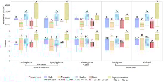 Oribatid mites are prevalent in most phreatic levels and salinity conditions. Notably, they were the only taxa present in polyhaline conditions at moderate phreatic levels. n both cases, they are more abundant in the loose litter layer. Anthropleona show increased richness and abundance in oligohaline salinities at moderate to shallow phreatic levels and in polyhaline salinities at deep levels, mainly located in the old litter layer. Conversely, Symphypleona are more abundant in freshwater conditions at slightly moderate phreatic levels, predominantly found in the old litter layer. Mesostigmata and Prostigmata exhibit an increased presence in oligohaline and mesohaline conditions at slightly moderate to high phreatic levels, with their abundance being greater in the loose litter layer.