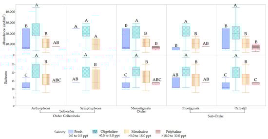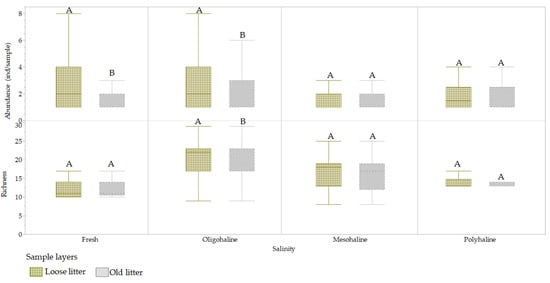 Statistical differences in mesofauna richness and abundance within the litter and soil organic layers across the salinity conditions. Values with different letters indicate means with significant differences (p < 0.05).