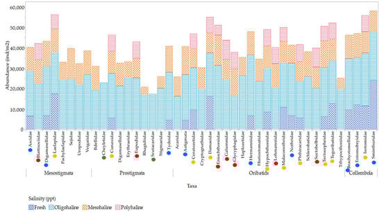 Between habitat-specific variations in richness and abundance, the mature 50-year shrubland of Dalbergia ecastaphyllum (L.) (SM habitat) emerges as a distinctive environment, consistently showcasing the highest richness throughout all observed periods. This heightened richness is likely fostered by the unique characteristics of the SM habitat, including a moderate phreatic level (mean value = −0.22 ± 0.16 m), the presence of oligohaline to low mesohaline salinities, canopy closure providing shade to the understory and soil, and enhanced litter inputs. These factors collectively cultivate a microenvironment conducive to a diverse mesofauna community, instigating shifts in the population dynamics [,,]. During the moist period, which occurs between flood events, the SM habitat exhibited a richness that was twice that of other habitats. This period was characterized by a moderate phreatic level and a prevailing low mesohaline salinity of 8.32 ± 2.09 ppt. The elevated richness during this period can be attributed to the higher micro-elevation of the SM habitat, which acts as a buffer against the high phreatic levels typically experienced during flood disturbances, a protection not afforded to other habitats especially the MMW and MWR which had similar microenvironments. This distinctive microenvironment fosters conditions favorable to colonization by a variety of mesofauna taxa that are well adapted to predominantly mesohaline salinities [,]. Families such as Acaridae (Oribatida), Digamasellidae (Prostigmata), and Uropodidae (Mesostigmata) exemplify this trend, as they exhibited a doubling in their abundance in the SM habitat during the moist period. Furthermore, the presence of these families was predominantly observed in oligohaline and low mesohaline conditions, suggesting a strong ecological preference or adaptability to these specific salinity ranges.