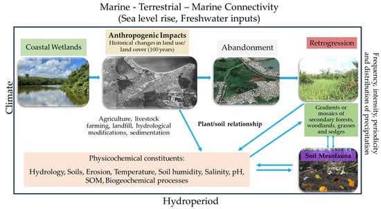 Historical changes in the land cover of coastal wetlands since colonial times, exemplified by the Ciénaga Las Cucharillas Natural Reserve, along with subsequent abandonment, have altered its hydrology and marine–terrestrial connectivity (upper axis). These modifications have led to shifts in the soil’s physicochemical constituents, subsequently affecting plant–soil interactions and mesofauna communities. The ongoing global and regional climate variability (left and right axes), sea-level rise (upper axis), and land use and cover changes act as additional stressors in this process. The combined effect of these anthropogenic stressors and the predominant wetland mosaic environment significantly influences the hydrological regime (lower axis), biophysicochemical components, and soil mesofauna diversity and abundance in the ecosystem.
