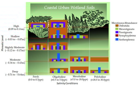 The combined effect between these anthropogenic stressors and the predominant wetland mosaic environment influences the hydrological regime, bio-physicochemical components, and soil mesofauna diversity, abundance, and functional relationships among taxa [,,,]. For instance, sea-level rise impacts coastal soil processes and modifies ecosystems’ net primary production due to variations in salinity, which has direct and indirect effects on soil mesofauna diversity and function []. In a field experiment in the Zhanjiang Plain wetland, simulated variations in the phreatic level due to precipitation changes demonstrated that mesofauna communities were significantly affected by changes in water level. Slight increases in total abundance were documented under natural water level dynamics, with significant reductions under constant high water level conditions [].