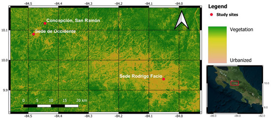 All sampling sites were located in the western section of the Costa Rican Central Valley (Figure 2) at an elevation of 1200 m, with an average temperature of 20.5 °C, with a dry season from December to April. We selected three sites based on the urban buildings and green zones (Figure 3, Table S1). The Central Campus of the University of Costa Rica, San José province (9°54′ N, 84°03′ W) was considered the most urbanized site since it includes many large buildings with only some green patches, gardens (dominated by grass), and small remnant patches of second-growth forest [6] (Figure 2). The Occidental Campus of the University of Costa Rica, Alajuela province (10°08′ N, 84°47′ W) was considered as the site with intermediate urbanization. This campus includes buildings separated by large green areas with abundant trees and grasslands. The third study site was Concepción, San Ramón, Alajuela province (10°11′ N, 84°44′ W). It is a small village in the countryside, dominated by coffee plantations, patches of trees, and second-growth forests. At this site, some farmers apply pesticides once or twice a year, but there are also green agriculture sites free of pesticides.