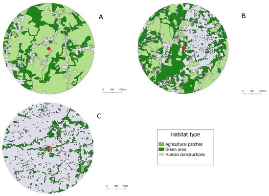 Different types of cover with a buffer zone of 2.5 km around the three sampling sites are indicated by red spots. (A) Low urbanization: Concepcion, San Ramon, a village with abundant agricultural areas and forest patches. (B) Intermediate urbanization: Occidental Campus of the University of Costa Rica, with a similar proportion of green cover, agricultural patches, and human constructions. (C) High urbanization: The Central Campus of the University of Costa Rica has the least green cover. We used Google Earth images from 2018 and QGIS to classify the cover shapes.