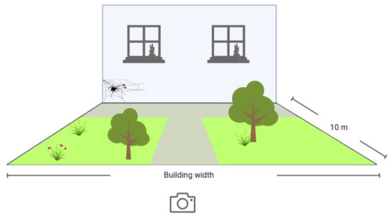 At each group of buildings, we estimated the percentage of green vs. gray areas to evaluate their effect on parasitoids at the local scale (microscale). To calculate the rate of green area, we took a panoramic photo at 10 m in front of each sampling structure (i.e., buildings and houses, Figure 4). From each photo, we obtained the proportion of bare soil, green area (e.g., grass and shrubs-trees), cemented area, and number of trees and bushes in front of each building using the polygon selection tool in Image J (version 1.53j, National Institutes of Health and Laboratory for Optical and Computational Instrumentation, Wisconsin, USA) [44]. We considered the local scale (microscale) component important because the surrounding environment could influence prey abundance for spiders, as well as the environmental conditions (e.g., relative humidity and ambient temperature) for spiders and parasitoids. These variables were measured once, as the number of trees, bushes, and cemented areas remained constant throughout the year.