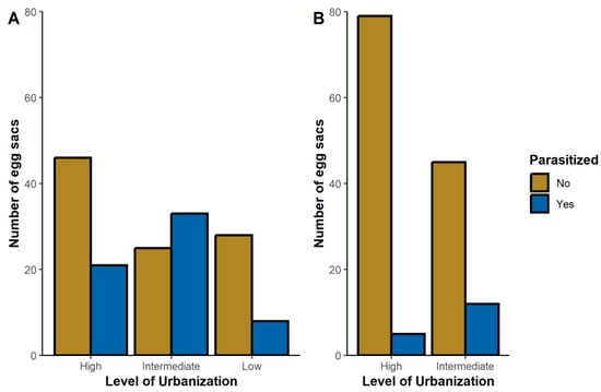 The number of parasitized and unparasitized egg sacs for each spider species along an urban gradient of high, intermediate, and low urbanization. (A) Parasteatoda tepidariorum and (B) Latrodectus geometricus.