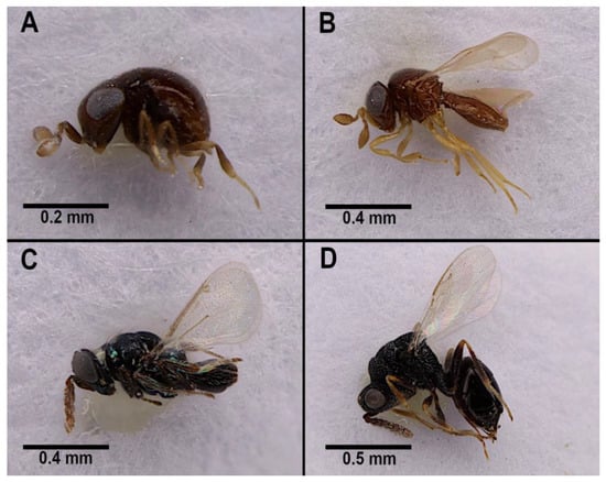 Parasitoid species. (A) Baeus achaearaneus ♀ and (B) Idris sp. ♀ (both Scelionidae) emerged from Parasteatoda tepidariorum egg sacs. (C) Pediobius pyrgo ♂ (Eulophidae) and (D) Philolema sp. ♀ (Eurytomidae) emerged from Latrodectus geometricus egg sacs.