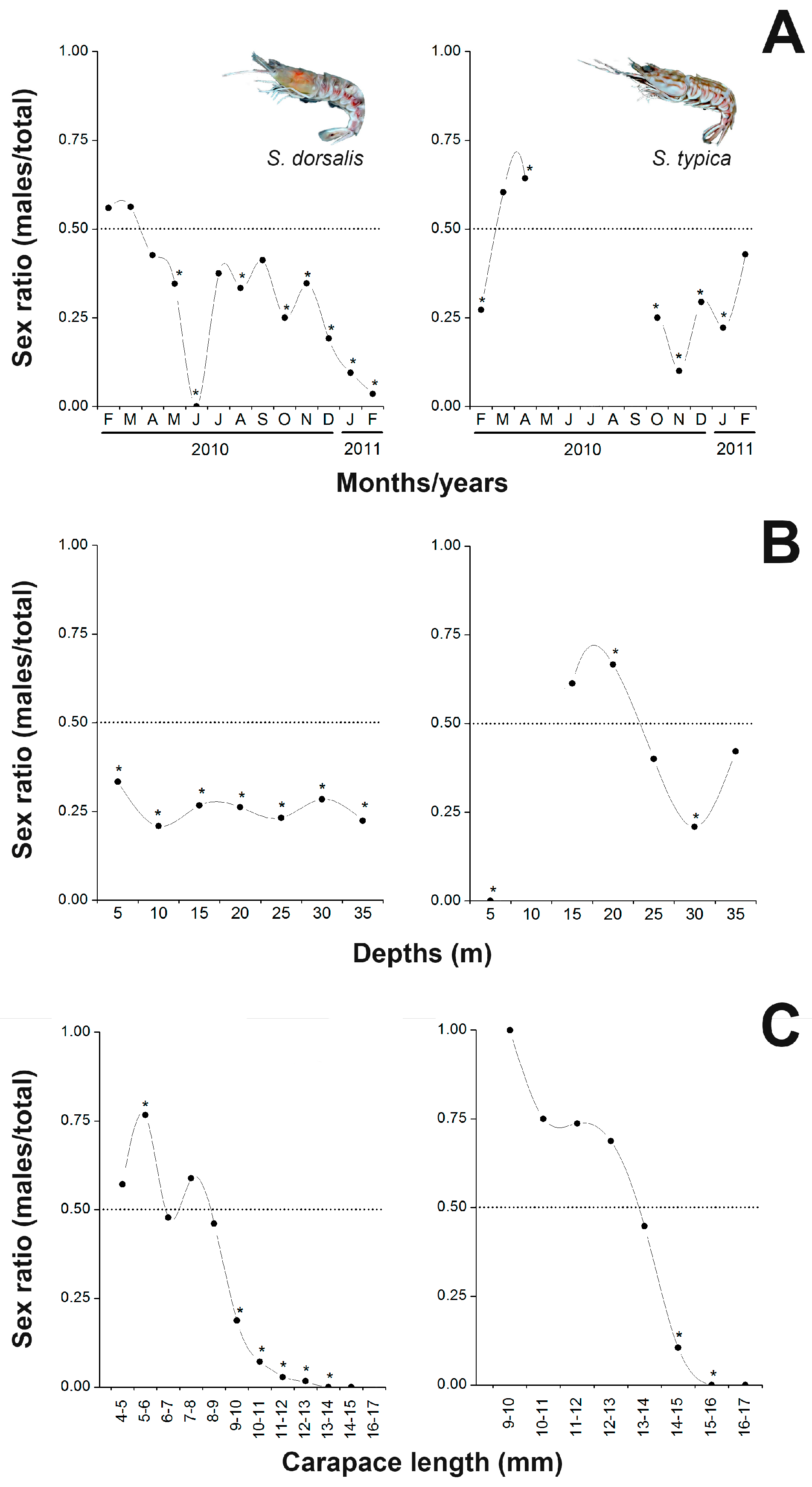 - Baeza, J.A.; Braga, A.A.; López-Greco, L.S.; Perez, E.; Negreiros-Fransozo, M.L.; Fransozo, A. Population dynamics, sex ratio and size at sex change in a protandric simultaneous hermaphrodite, the spiny shrimp Exhippolysmata oplophoroides. Mar. Biol. 2010, 157, 2643–2653. [Google Scholar] [CrossRef]