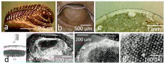 The eye of Gerastos (picture is smaller (less wide) than the others), just 1 column wide. (a) Gerastos cuvieri (Steininger, 1831), Ahrdorf Fm., Eifelian, Middle Devonian period, Gees, Eifel, Germany. (b) Compound eye of G. cuvieri with a smooth surface. (c) Thin section of the eye. Note that the visual surface integrated into the cuticle is a specialized part of the cuticle. (d) Lindstöm’s plate VI, 20, Proetus [Proetus] concinnus Dalman, 1827. (e) Broken eye of G. cuvieri. Note the thick visual surface and the relics of the visual units below (white dots). (f) Magnification of a part of (e). (g) Relicts of the sensory units are separated quite far from each other.