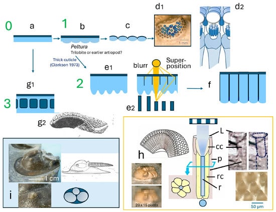 In most holochroal eyes, the sensory apparatus is probably identical, more or less, and similar to an apposition compound eye [27,41]. Considering only the formation/evolution of proper lenses in trilobites, one may establish a theoretical series of steps (Figure 5a–f), showing how a smooth, transparent cuticle could have developed into functioning, i.e., light-focusing lenses over time without any reference to phylogenetic relationships. This sequence is a model, and the processes may have occurred independently and at different times in the different systematic groups, so the different types of lenses trilobites possess may represent different stages of achievements.
