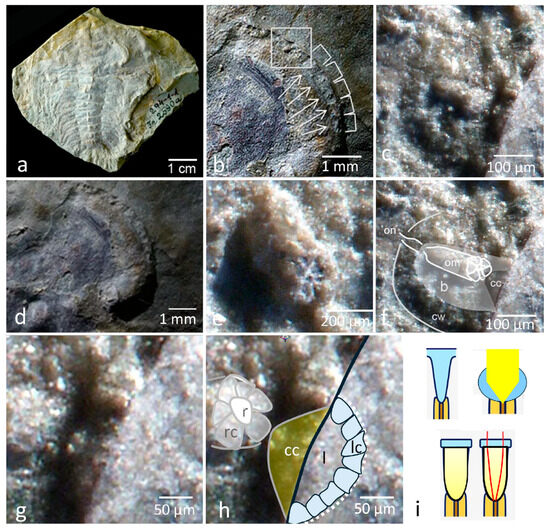 At first glance, here we find, as Lindström did [11] (Figure 7h–j), relicts of an unstructured tissue, which would be expected to represent the remains of a small retina composed of receptor cells and perhaps isolated by pigment cells, which would make possible a better resolution of the input to individual sensory cells. Retinal compound eyes in arthropods, however, are very unusual. All retinal compound eyes in modern arthropods are secondary, as in myriapods, chelicerates, and the specialized eyes of insects (e.g., larval eyes of insects (stemmata) or the eyes of Xenos peckii Kirby, 1813 (Strepsiteria)).