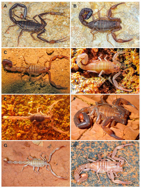 - Kovařík, F.; Lowe, G.; Šťáhlavský, F. Review of Northwestern African Buthacus, with Description of Buthacus stockmanni Sp. n. from Morocco and Western Sahara (Scorpiones, Buthidae). Euscorpius 2016, 2016, 1–18. [Google Scholar] [CrossRef]
