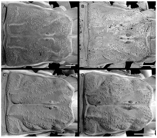 Carapace of Troglorhopalurus species, including T. translucidus ((A) adult female, ISLA 126484), T. lacrau ((B) adult female, CHNUFPI 1651), and T. iuiu n. sp. ((C) adult female paratype, ISLA 126476; and (D) adult male holotype, ISLA 126474). Scale bars: 0.5 mm.