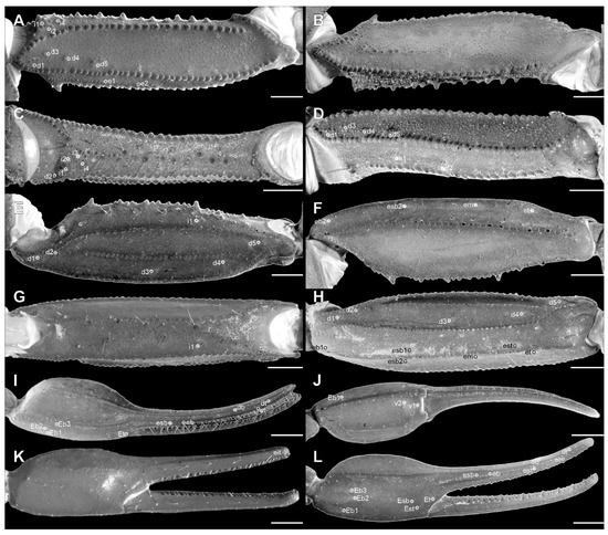 Trichobothria. The femur has an orthobothriotaxic pattern (11 trichobothria: d1–d5, e1, e2, and i1–i4) (Figure 4A–D and Figure 9E–H), with d2 located on the prolateral surface and d3 located in the dorsomedian region in between DE and DI carinae (α configuration) (Figure 4A and Figure 9E). The patella has an orthobothriotaxic pattern (13 trichobothria: d1–d5, eb1, eb2, esb1, esb2, em, est, et, and i1) (Figure 4E–H and Figure 10E–H). The chela has an orthobothriotaxic pattern (15 trichobothria: db, dt, Eb1–Eb3, Esb, Est, Et, eb, esb, est, et, it, V1, and V2) (Figure 4I–L and Figure 11E–H). Eb3 and Esb are petite; db is distal to est. Eb1, Eb2, and Eb3 are almost aligned between each other; Eb2 and Eb3 are closer to each other than to Eb1.