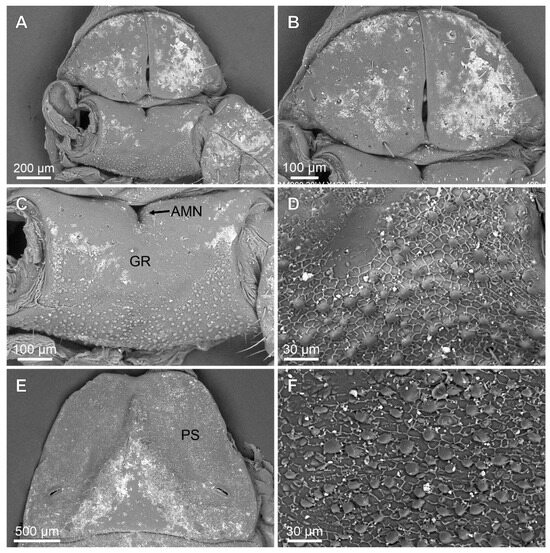 Coxosternal region. This region is mostly smooth with a few fine granules and setae. The sternum is subtriangular, with a posterior depression (Figure 5A–C). The genital operculum is longitudinally divided and composed of two trapezoidal plates (Figure 5A,B).