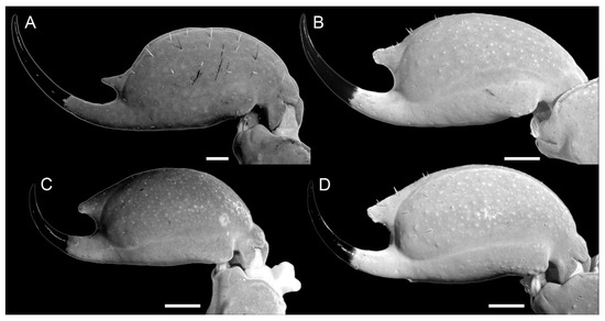 Pedipalps. The femur (Figure 9A–D and Figure 14A) has seven carinae: PD, PV, and RD are complete, serratocrenulate; DM is vestigial, restricted to a few fine granules in the posterior third of the hand; PM is vestigial, crenulate restricted to a few coarse granules associated with strong setae; RM is vestigial, crenulate formed by fine granules; and RV is complete, crenulate with sparse coarse granules. Intercarinal areas are smooth or with sparse fine granules. The patella (Figure 10A–D and Figure 14B) has seven carinae: DM is incomplete, vestigial on its anterior and posterior borders, serratocrenulate; PD, PV, and RD are complete, serratocrenulate; PM is complete, crenulate with large spiniform granules; RM is complete, serratocrenulate with fine granules; and RV is complete, smooth. Intercarinal areas are mostly smooth, except for the area between the promedian and prodorsal carinae, with sparse coarse granules associated with large setae. Chela (Tibia) (Figure 11A–D). The chela manus is not incrassate (Figure 11A–D). It contains ten carinae: D is complete and serratocrenulate; DM is vestigial, absent in the anterior third of the hand; DS is almost complete, absent in the anterior third of the hand, serratocrenulate; PD and PM are vestigial, limited to a few sparse fine granules in the median portion of the hand; PV and RV are complete and smooth; RM is complete, serratocrenulate with sparse granules in the median portion of the hand; RS is vestigial, restricted to a few sparse granules in the anterior third; and SA is vestigial, restricted to a few sparse granules in the anterior third. VM is absent, and intercarinal areas are smooth. The pedipalp is movable and contains fixed fingers without a basal lobe (Figure 11B,D). The dorsal surface of the movable finger contains 08 oblique rows of primary denticles flanked closely by pro- and retrolateral accessory (supernumerary) denticles. Fixed fingers contains 07 rows of primary denticles, as in the movable finger.