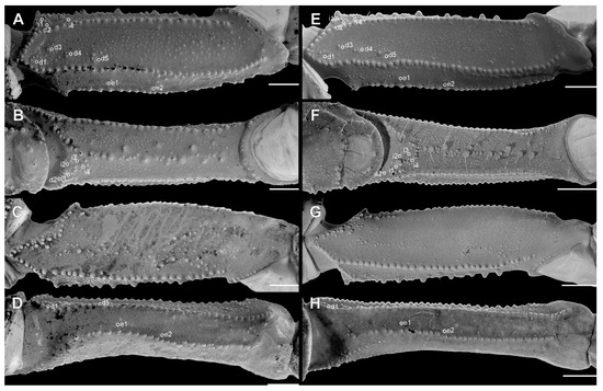 Pedipalp femur of Troglorhopalurus lacrau ((A–D) adult female, CHNUFPI 2321) and T. iuiu n. sp. ((E–H) adult female paratype, ISLA 126476), in dorsal (A,E), prolateral (B,F), ventral (C,G), and retrolateral (D,H) views. Scale bars: 0.5 mm.