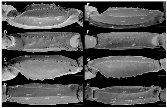 Trichobothria. The femur has an orthobothriotaxic pattern (11 trichobothria: d1–d5, e1, e2, and i1-i4) (Figure 9A–D and Figure 14A), with d2 located on the prolateral surface and d3 located in the dorsomedian region in between DE and DI carinae (α configuration) (Figure 9A and Figure 14A). The patella has an orthobothriotaxic pattern (13 trichobothria: d1–d5, eb1, eb2, esb1, esb2, em, est, et, and i1) (Figure 10A–D and Figure 14B). The chela has an orthobothriotaxic pattern (15 trichobothria: db, dt, Eb1–Eb3, Esb, Est, Et, eb, esb, est, et, it, V1, and V2) (Figure 11D). Eb3 and Esb are petite; db is distal to est. Eb1, Eb2, and Eb3 are almost aligned between each other; Eb2 and Eb3 are closer to each other than to Eb1.