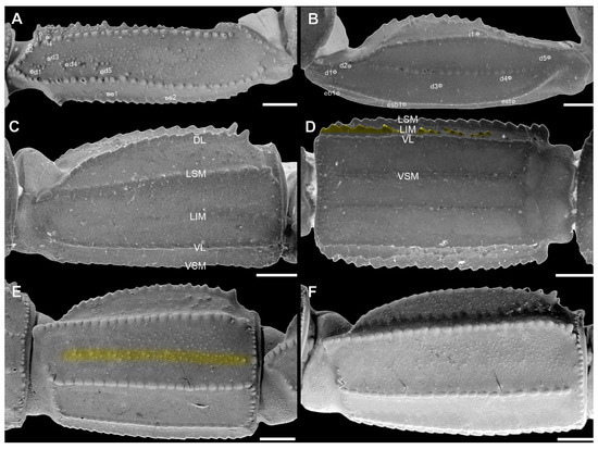 Pedipalp femur (A), patella (B) and metasomal segment II (C–F) of Troglorhopalurus lacrau from Ituaçu ((A–D) adult female, CHNUFPI 6892) and Itaeté ((E) adult female, CHNUFPI 2321); and of T. iuiu n. sp. ((F) adult female paratype, ISLA 126476) in dorsal (A,B), lateral (C,E,F), and ventral (D) views. The lateral inframedian carinae of the metasomal segment II is highlighted in yellow on one side of the segment in (D) (coarse granules in the anterior half) and in (E) (complete carinae with fine granules). Abbreviations: DL—dorsolateral carinae; LIM—lateral inframedian carinae; LSM—lateral submedian carinae; VL—ventrolateral carinae; VSM—ventrosubmedian carinae. Scale bars: 0.5 mm.