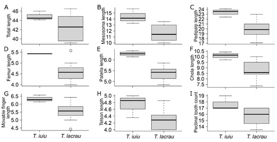 Comparison of morphometric variables between Troglorhopalurus lacrau and T. iuiu n. sp. Only significant comparisons described in Table 1 are displayed. Variables: (A) total length; (B) mesosoma length; (C) pedipalp total length; (D) femur length; (E) patella length; (F) chela length; (G) chela movable finger length; (H) telson total length; (I) pectinal tooth count.