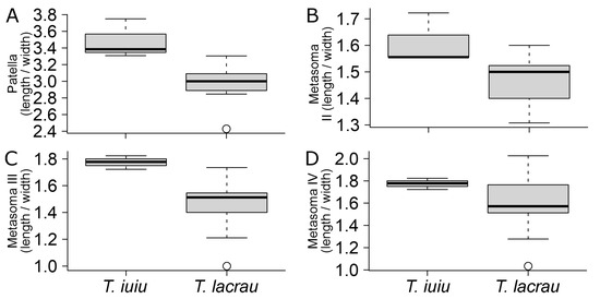 Comparison of morphometric ratio variables between Troglorhopalurus lacrau and T. iuiu n. sp. Only significant comparisons described in Table 2 are displayed. Variables: (A) patella (length/width); (B) metasoma II (length/width); (C) metasoma III (length/width); (D) metasoma IV (length/width).