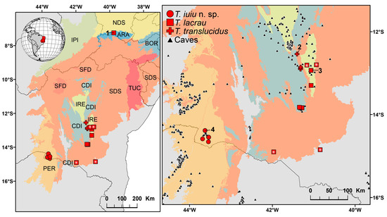 Known geographic distribution of the scorpion genus Troglorhopalurus, including its three valid species: Troglorhopalurus iuiu n. sp. (red circles), T. lacrau (red squares), and T. translucidus (red crosses). Records with asterisks represent those obtained through photographs. Shaded areas represent the Caatinga biogeographic ecoregions [10]: ARA—Araripe District; BOR—Borborema District; CDI—Chapada Diamantina Province; IPI—Ibiapaba-Piauí District; IRE—Irecê District; NDS—Northern Depressão Sertaneja District; PER—Peruaçu District; SDS—Southern Depressão Sertaneja District; SFD—São Francisco Dunes District; and TUC—Tucano-Jatobá District. Black triangles represent records of caves in regions close to the records of Troglorhopalurus in the state of Bahia. Numbered sites: (1) Chapada do Araripe, type-locality of Rhopalurus brejo; (2) Gruta do Lapão cave, Lençóis, type-locality of T. translucidus; (3) Lapa do Bode cave, Itaeté, type-locality of T. lacrau; and (4) Lapa do Baixão cave, Iuiú, type-locality of T. iuiu n. sp.