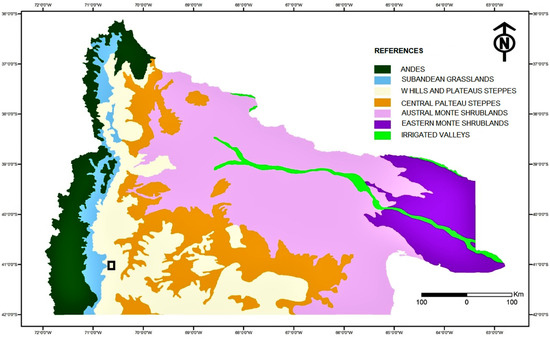 Study area (black rectangle). Biozones in North Patagonia, Argentina.