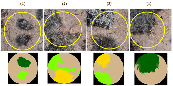 Examples of different compositions of patches (0.5 square meter): (1) Perennial grasses (Poa ligularis, Pappostipa speciosa and bare soil), (2) Deciduous shrub-grass (Azorella prolifera, Poa ligularis and bare soil), (3) Perennial shrub-grass (Senecio filaginoides, Poa ligularis and bare soil), (4) Deciduous shrub (Azorella prolifera and bare soil). Below the photographs are the images of the performed classification to estimate area cover of each component (vegetation: green and yellow), bare soil (light brown), respectively. It should be noticed that only four of the twelve patches are shown as examples of the used procedure.