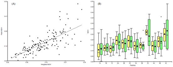 (A) Linear regression between weighted and patch NDVI measurements—black dots—(y = 0.01 + 0.94x; R2 = 0.55, Adjusted R2 = 0.55, p < 0.0001). (B) Box-plots of NDVI values between October 2015 and March 2017 for weighted (yellow) and patch level (green) measurements, for the patches 1: Perennial grasses, 2: Deciduous shrub–grass, 3: Perennial shrub–grass, 4: Deciduous shrub, with their respective replicates: A, B and C (Table 1).