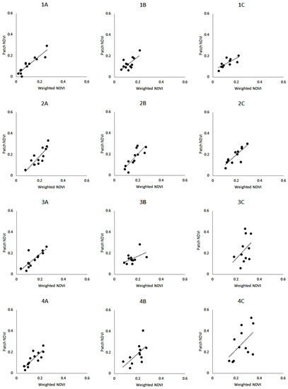 Linear regressions between weighted and patch NDVI measurements (black dots) between October 2015 and March 2017, for the different patches: (1) Perennial Grasses, (1A) y = 0.02 + 0.91x; R2 = 0.84, AdjR2 = 0.83, p < 0.0001; (1B) y = 0.02 + 0.85x; R2 = 0.46, AdjR2 = 0.42, p = 0.0103; (1C) y = 0.06 + 0.59x; R2 = 0.57, AdjR2 = 0.52, p = 0.0074; (2) Deciduous Shrub-Grass, (2A) y = −0.05 + 1.19x; R2 = 0.69, AdjR2 = 0.67, p = 0.0004; (2B) y = −0.04 + 1.18x; R2 = 0.67, AdjR2 = 0.64, p = 0.0012; (2C) y = −1.5 × 10−3 + 0.99x; R2 = 0.70, AdjR2 = 0.67, p = 0.0007; (3) Perennial Shrub-Grass, (3A) y = 0.01 + 0.93x; R2 = 0.65, AdjR2 = 0.62, p = 0.0008; (3B) y = 0.07 + 0.50x; R2 = 0.26, AdjR2 = 0.19, p = 0.0902; (3C) y = −0.10 + 1.20x; R2 = 0.16, AdjR2 = 0.06, p = 0.2301; and (4) Deciduous Shrub, (4A) y = −0.01 + 0.99x; R2 = 0.69, AdjR2 = 0.66, p = 0.0004; (4B) y = −0.01 + 0.99x; R2 = 0.37, AdjR2 = 0.30, p = 0.0367; (4C) y = −3.2 × 10−3 + 1.13x; R2 = 0.29, AdjR2 = 0.22, p = 0.0697. Reference: Adjusted R2 (AdjR2).