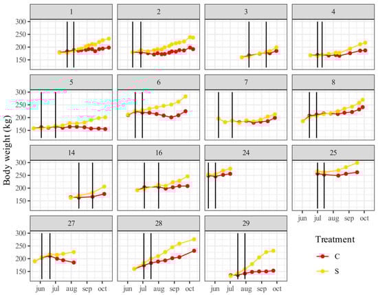Body weight (BW) against time, separated by control (C) or supplemented (S) animal groups and their different phases in a database of 15 supplementation experiments for young beef cattle on native grasslands in Uruguay (2004–2018). Control groups (C): red lines; supplemented groups (S): yellow lines; limits of phases according to the FindPick function (quantmod R®): black vertical lines.