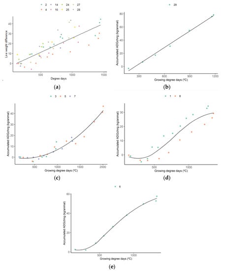 Accumulated average daily gain change (ADGchng) between supplemented and control plots, against growing degree days (GDD, base temperature = 0 °C) for all experiments in a database of 15 supplementation experiments for young beef cattle on native grasslands in Uruguay (2004–2018). (a) Trials 2, 4, 14, 16, 24, 25, 27, 28 (linear); (b) Trial 29 (linear); (c) Trials 3, 5, 7 (quadratic); (d) Trials 1, 8 (Weibull); (e) Trial 6 (Weibull). (a) y = −3.37 + 0.029x, R2 = 0.6872, RSE = 7.52, p < 0.0001; (b) y = −21.19 + 0.083x, R2 = 0.9944, RSE = 2.69, p < 0.0001; (c) y = −0.078 − 0.00716x + 0.0000142 × 2, R2 = 0.9531, RSE = 3.01, p < 0.0001; (d) y = 29.82 − 32.68 × exp(−exp(23.54) × 3.46), RSE = 5.1, p < 0.0001; (e) y = 57.72 − 57.19 × exp(−exp(17.59) × 2.60), RSE = 1.96, p < 0.0001.