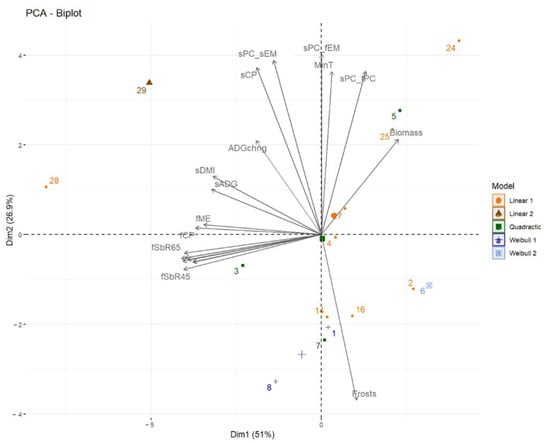 Components 1 and 2 of the PCA explained 77.9% of the total data variation. Linear models did not present a distinct association with any particular set of other relevant variables. It is important to highlight that trial 29 (Linear 2) had the highest accumulated ADGchng and was associated with sDMI, sADG, sCP, sPC:sEM, fME and fCP. On the other hand, quadratic models appeared more associated with herbage biomass and substitution rates (both sSbR and hSbR). Weibull models were more closely associated with frosts, yet very distant from all other variables (Figure 4).