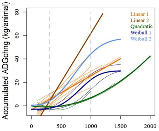 Three main supplementation responses (regression models) were identified (Figure 3). The response was either linear, quadratic or with a Weibull distribution, where ‘y’ represents the accumulated ADGchng (i.e., the total BW difference between S and C groups), and ‘x’ is GDD. In the first case (linear response), accumulated ADGchng increased at a regular rate. In the case of the quadratic and Weibull response, the response was slow at the beginning of the trials, and then it accelerated until the end of the period (quadratic) or slowed down towards the end (Weibull).