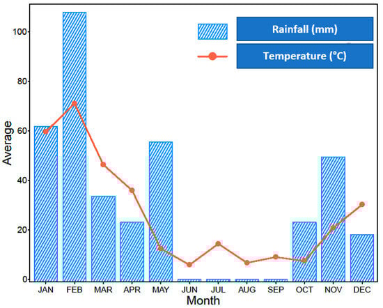 The study was conducted in MZNP (Figure 1), which covers an area of approximately 28,412 ha and is in the Eastern Cape Province, South Africa (32°22′47″ S; 25°47′8″ E). The park comprises three biomes of South Africa: Karoo Escarpment Grassland (53%), Eastern Upper Karoo (37%), and Eastern Cape Escarpment Thicket (10%) []. The Eastern Upper Karoo is characterized by flat and gently sloping plains, interspersed with hills and rocky areas where the dominant flora are dwarf microphyllous shrubs (Pentzia incana and Eriocephalus ericoides) []. The Karoo Escarpment Grassland is characterized by low mountains and hills, with wiry tussock grasslands and mountain wire grass (Merxmuellera disticha) being the dominant flora. The Eastern Cape Escarpment Thicket is characterized by steeply sloping escarpment and mountain slopes with medium-high and semi-open to closed thicket, where the dominant flora are olive trees (Olea europaea) []. The park is located on the northern slopes of the Bankberg mountain range []. It is dominated by sedimentary rock types such as the sandstones, siltstones, and mudstones of the Beaufort Series []. Mountainous terrain with steep-sided drainage lines makes up the southern quarter of the park, where the highest point is found along Bankberg Mountain at 1957 m above sea level, with the lowest part of the park in the northern section only reaching 1000 m above sea level [,]. The soil in the park is predominantly shallow, with large areas of the park being rocky and having minimal or no topsoil [,]. The average monthly temperature in summer (September to March) varies between a minimum of 6 °C and a maximum of 28 °C, whereas in winter (April to August), the temperature often drops below 0 °C and reaches maximums of 20 °C []. Rainfall occurs regularly from December to April [], and the average annual rainfall is 400 mm (Figure 2) []. The region experiences periodic light snow during the winter months, and frost is common between May and October [].