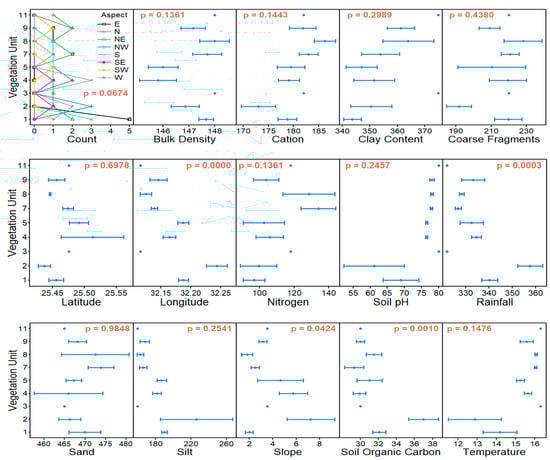 Both the species richness and the NSDI had low p-values (≈0.0003), indicating a statistically significant difference between richness and diversity across the vegetation units (Table 2). Unit 1 contained the highest number of species (34), whereas Unit 11 had more than five times fewer species (6). Subsequently, the degree of pairwise relationships between the vegetation unit response and each different environmental predictor was investigated using ANOVA and linear correlations.