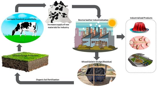 Despite the positive results found by these studies, the elevated levels of sodium present in mixed gelatin sludge (MGS) suggest practical limits on its application, as this may cause serious risks to the development of plants or to the health of humans and animals []. Therefore, this type of sludge, like others, must be applied within previously established limits, as application without technical knowledge or in sensitive areas may cause contamination of soil or subsurface water [,,,,]. On the other hand, the responsible use of MGS could increase livestock productivity, especially in tropical Brazil, where there are low-fertility soils and large expanses of degraded pasture. Furthermore, using MGS as fertilizer in livestock production areas guarantees a safer destination for this industrial waste compared to disposal in landfills. It can also contribute to the circular economy of livestock activity in the region by better integrating processed cattle waste with tropical grass forage (Figure 1). Currently, there is no conclusive published research on the use of MGS and its impacts on soil and forage plants. Therefore, the objective of this study is to determine the appropriate dose of MGS for use in the production of Marandu grass during both dry and rainy seasons in Brazil.
